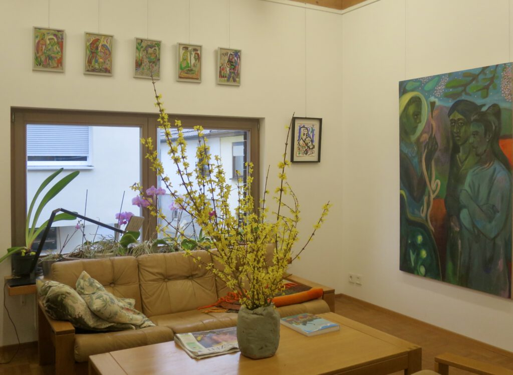 Das gilt auch für die 150 × 120 cm große Arbeit »Im Garten« von 2019 und ihr Gegenstück »Hortus conclusus« von 2025, die beide an das nicht mehr betretbare Paradies erinnern. Weiter für den zur Weihnachtsgeschichte gehörigen »Hirten« von 2019, die Begegnung von Petrus und Jesus bei dessen Gang ins Prätorium, in den Amtssitz von Pontius Pilatus, in dem er zum Tode verurteilt worden ist. Und das gilt schließlich auch für Maria Magdalena, die am frühen Ostermorgen den verstorbenen Jesus in seinem Grab salben will, ihn dort nicht mehr antrifft, ihm vor dem Grab zunächst unerkannt begegnet, ihn für den Gärtner hält und ihn erst erkennt, als er sie mit ihrem Namen anspricht. Als sie ihn berühren will, sagt er: „Noli me tangere“, „Berühre mich nicht“, „Halte mich nicht fest“.